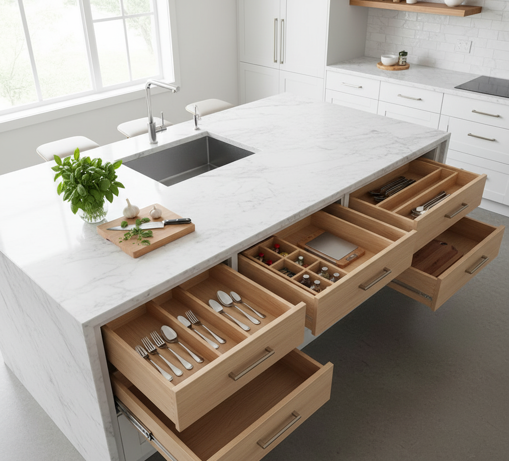 Good kitchens support prep, cook, and clean tasks. We reduce extra steps and wasted motion. Organizers, pull-outs, and tray dividers improve flow. A right-sized island adds work space and seating without blocking paths.