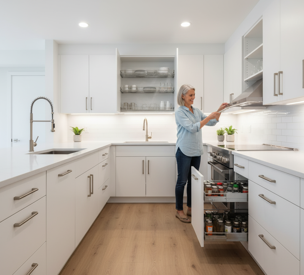 We widen clearances where possible. We use lever hardware and pull-down shelves. We add task lighting and consider non-slip flooring. The kitchen becomes safer and easier to use.