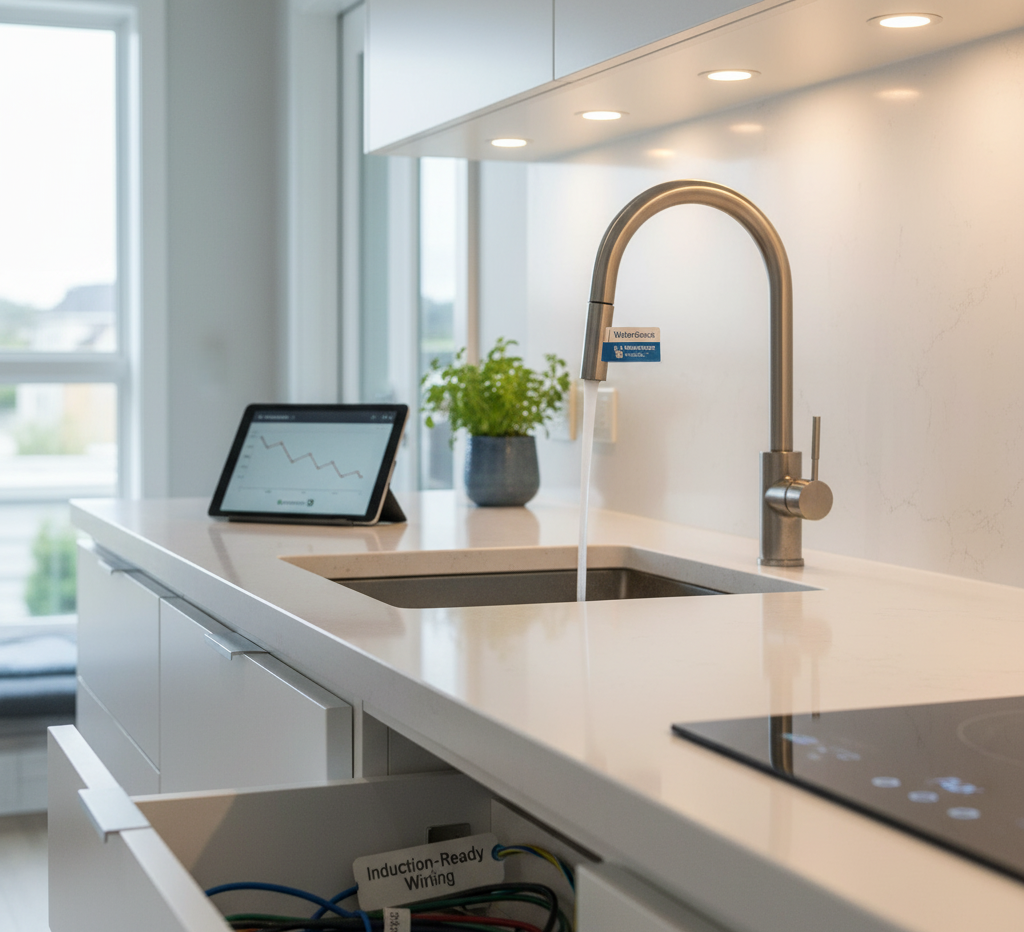 LED lighting lowers energy costs. Induction-ready wiring supports future upgrades. Water-saving fixtures help your bills. Durable surfaces cut maintenance and keep the kitchen looking fresh.