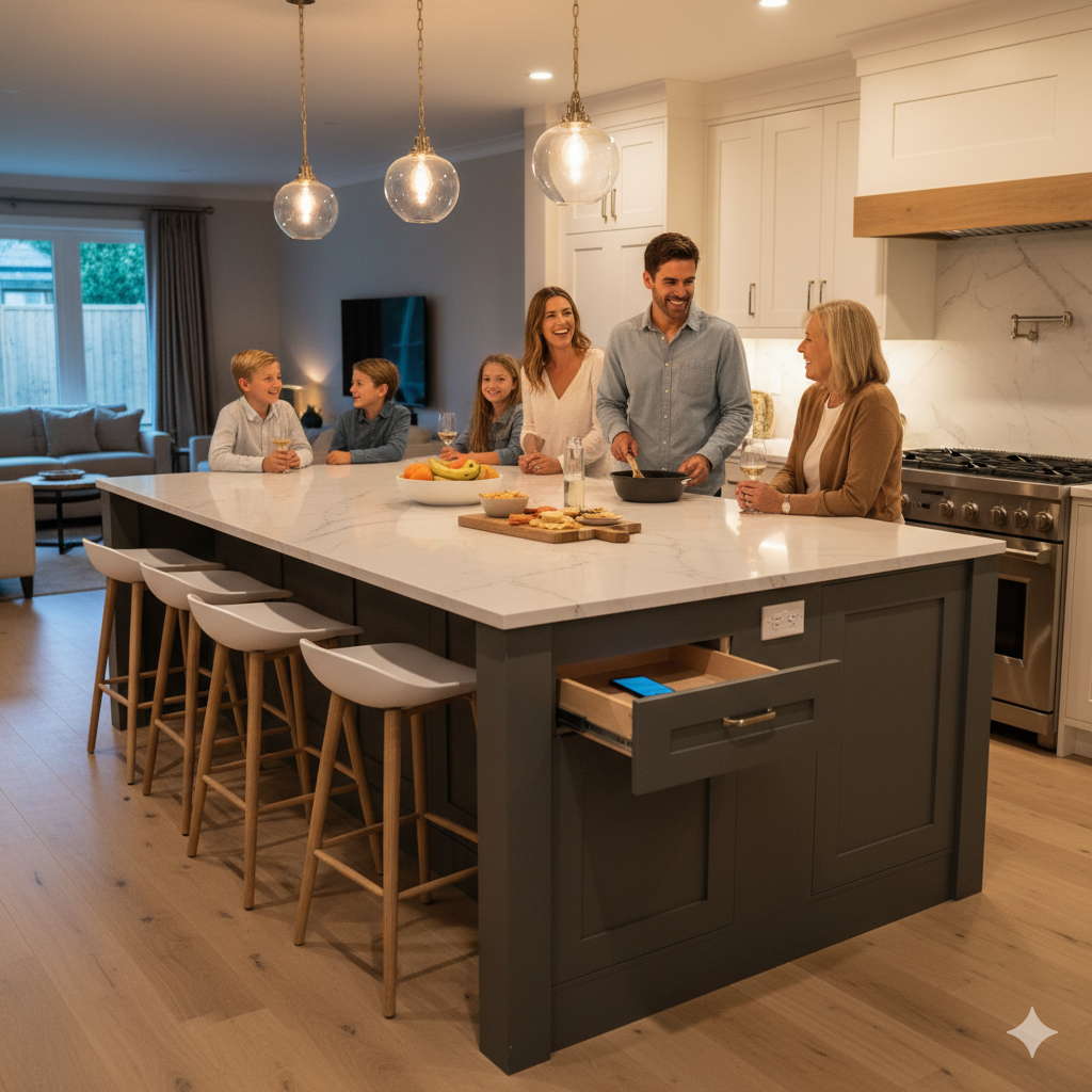 Islands with seating invite guests to gather while you cook. We fix traffic pinch points and plan useful lighting scenes. Charging drawers and appliance garages keep counters clear.