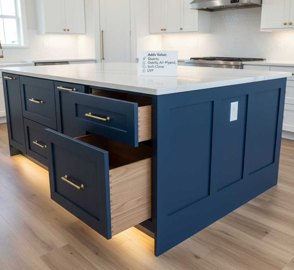 Quartz or porcelain counters stand up to daily use. All-plywood cabinet boxes and soft-close hardware last longer. Layered lighting and a ducted hood add function. LVP and tile resist wear from pets and kids. An island or peninsula improves modern living.
