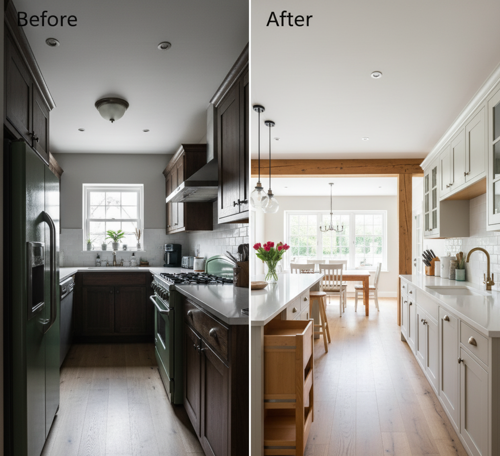 We redesigned a narrow kitchen and added custom pull-outs. Storage rose by a significant margin. The kitchen now handles everyday cooking without clutter.