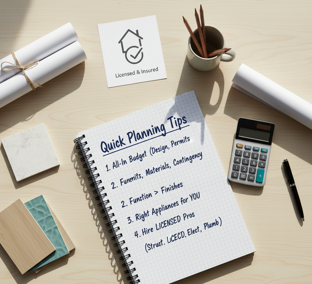 Set an all-in budget that includes design, permits, materials, labor, and a smart contingency. Prioritize function before finishes. Choose appliances that match how you cook. Hire licensed pros for structural, electrical, and plumbing work.